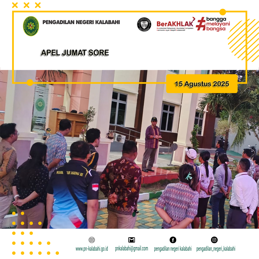 Kalabahi, 15 Agustus 2025 pukul 16.30 WIB bertempat di halaman Kantor Pengadilan Negeri Kalabahi dilaksanakan kegiatan Apel Sore yang dipimpin oleh YM. Ketua Pengadilan Negeri Kalabahi R. M. Suprapto, S.H. Selaku pembina Apel. Selanjutnya yang bertugas sebagai Komandan Apel adalah Bapak Kasiminius L. Tanghamap. (Staf Umum dan Keuangan). Kegiatan Apel Sore diikuti oleh Para Hakim, Pejabat Struktural dan Fungsional, Pegawai, PPNPN dan Siswa/i Magang SMKN1 Kalabahi pada Pengadilan Negeri Kalabahi.