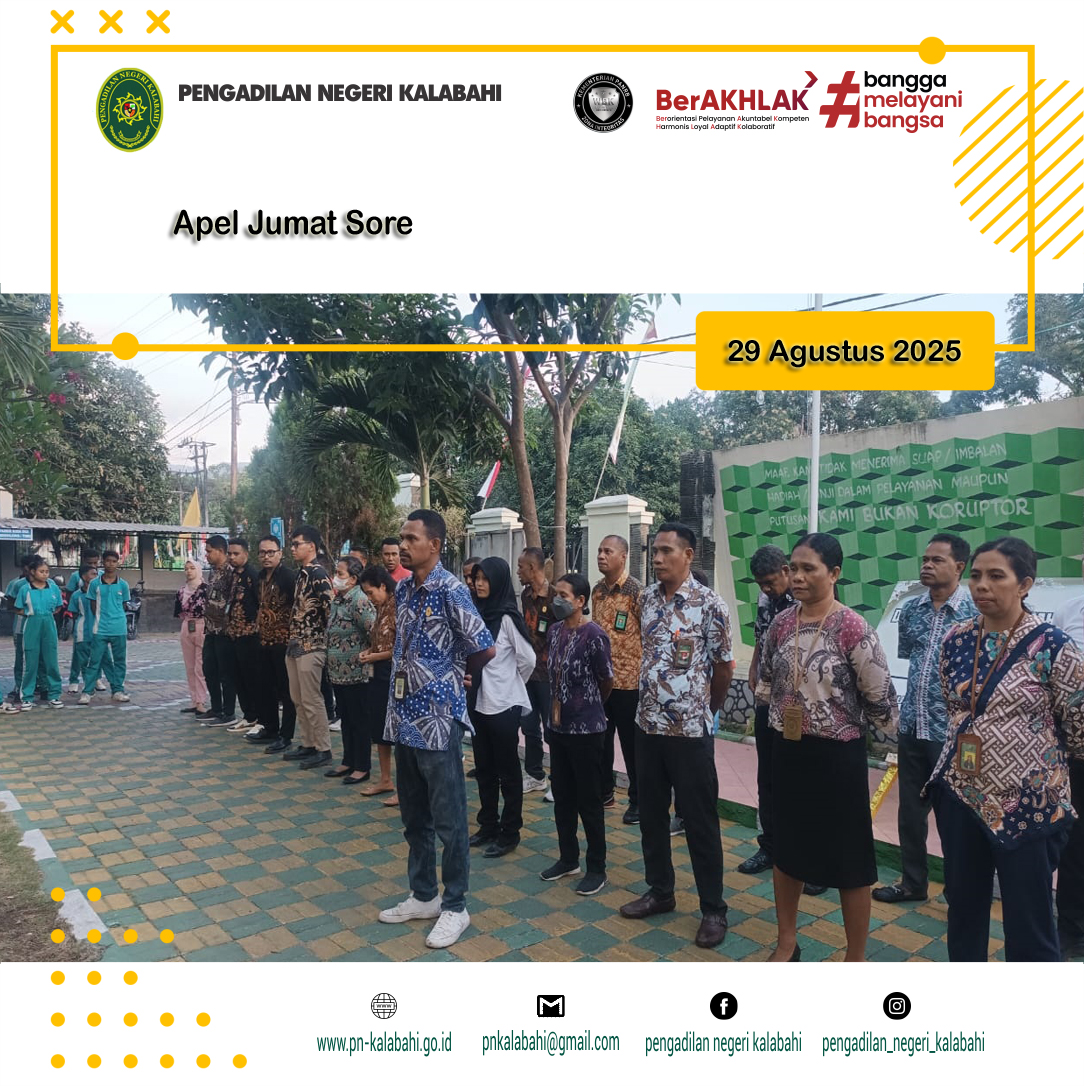 Kalabahi, 29 Agustus 2025 pukul 16.30 WIB bertempat di halaman Kantor Pengadilan Negeri Kalabahi dilaksanakan kegiatan Apel Sore yang dipimpin oleh YM. Ketua Pengadilan Negeri Kalabahi R. M. Suprapto, S.H. Selaku pembina Apel. Selanjutnya yang bertugas sebagai Komandan Apel adalah Bapak Wahyu Born Again Mnanapa (PPNPN). Kegiatan Apel Sore diikuti oleh Para Hakim, Pejabat Struktural dan Fungsional, Pegawai, PPNPN dan Siswa/i Magang SMKN1 Kalabahi pada Pengadilan Negeri Kalabahi.