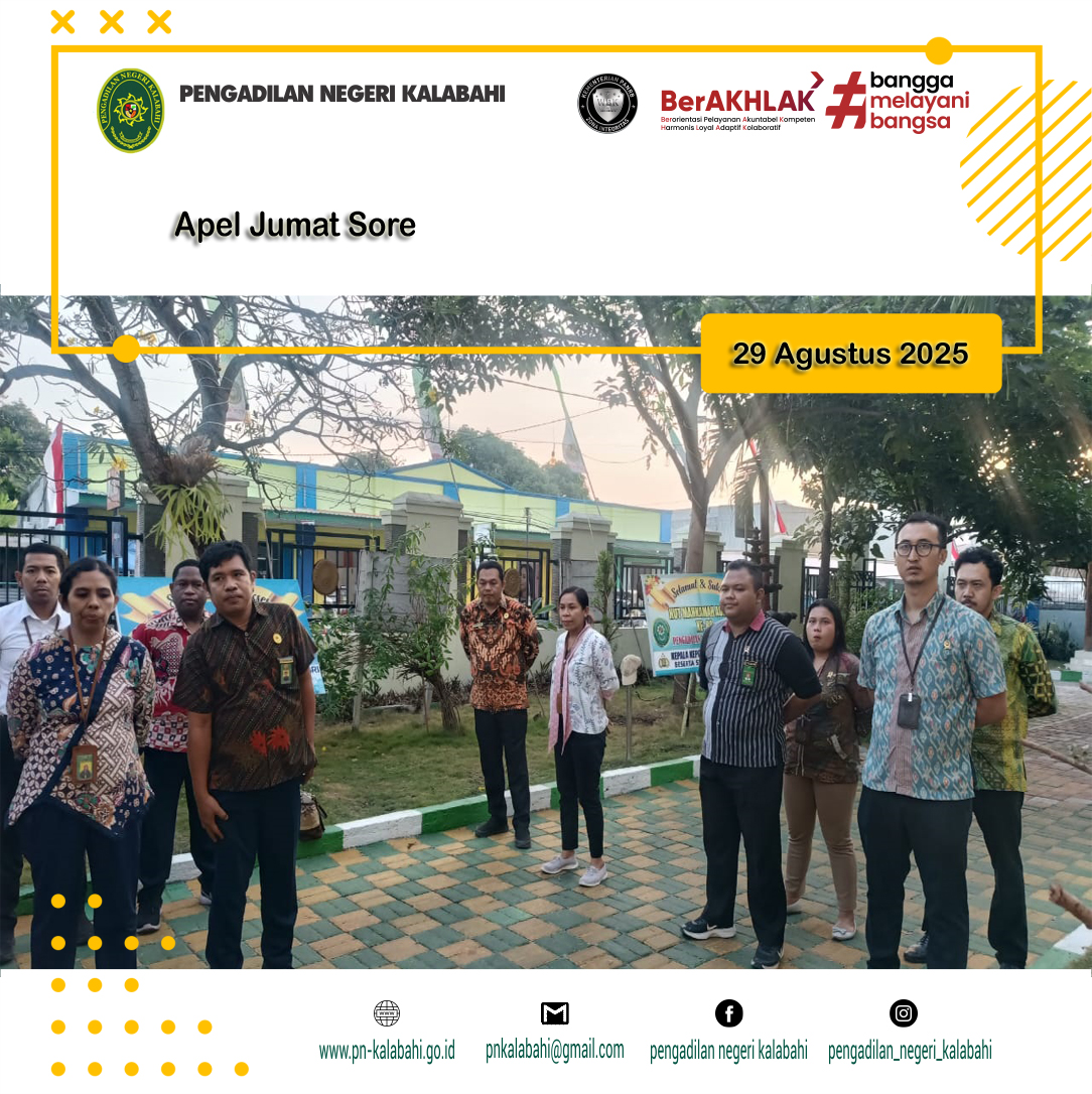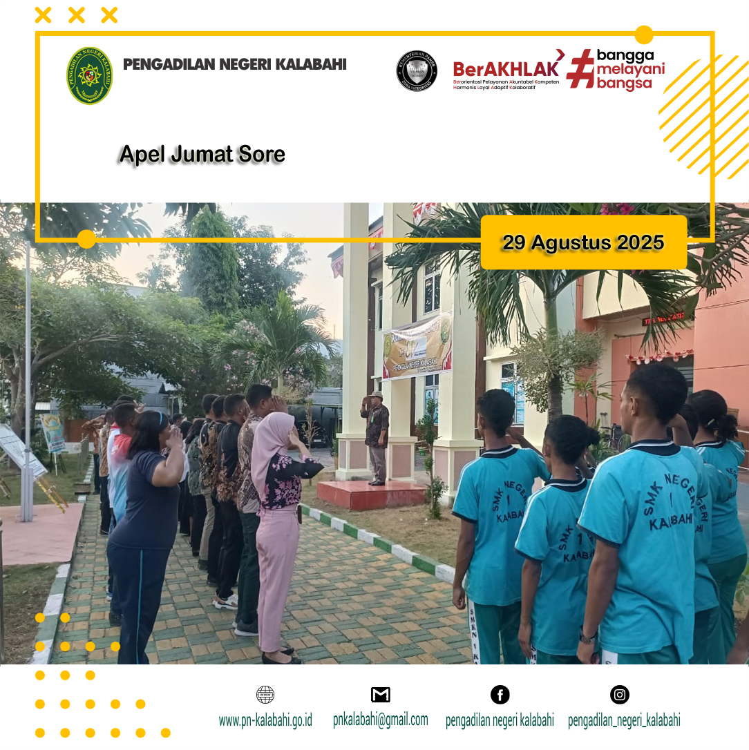 Kalabahi, 29 Agustus 2025 pukul 16.30 WIB bertempat di halaman Kantor Pengadilan Negeri Kalabahi dilaksanakan kegiatan Apel Sore yang dipimpin oleh YM. Ketua Pengadilan Negeri Kalabahi R. M. Suprapto, S.H. Selaku pembina Apel. Selanjutnya yang bertugas sebagai Komandan Apel adalah Bapak Wahyu Born Again Mnanapa (PPNPN). Kegiatan Apel Sore diikuti oleh Para Hakim, Pejabat Struktural dan Fungsional, Pegawai, PPNPN dan Siswa/i Magang SMKN1 Kalabahi pada Pengadilan Negeri Kalabahi.