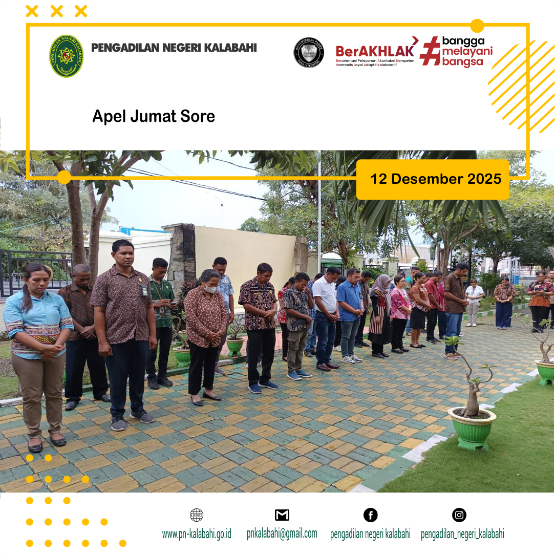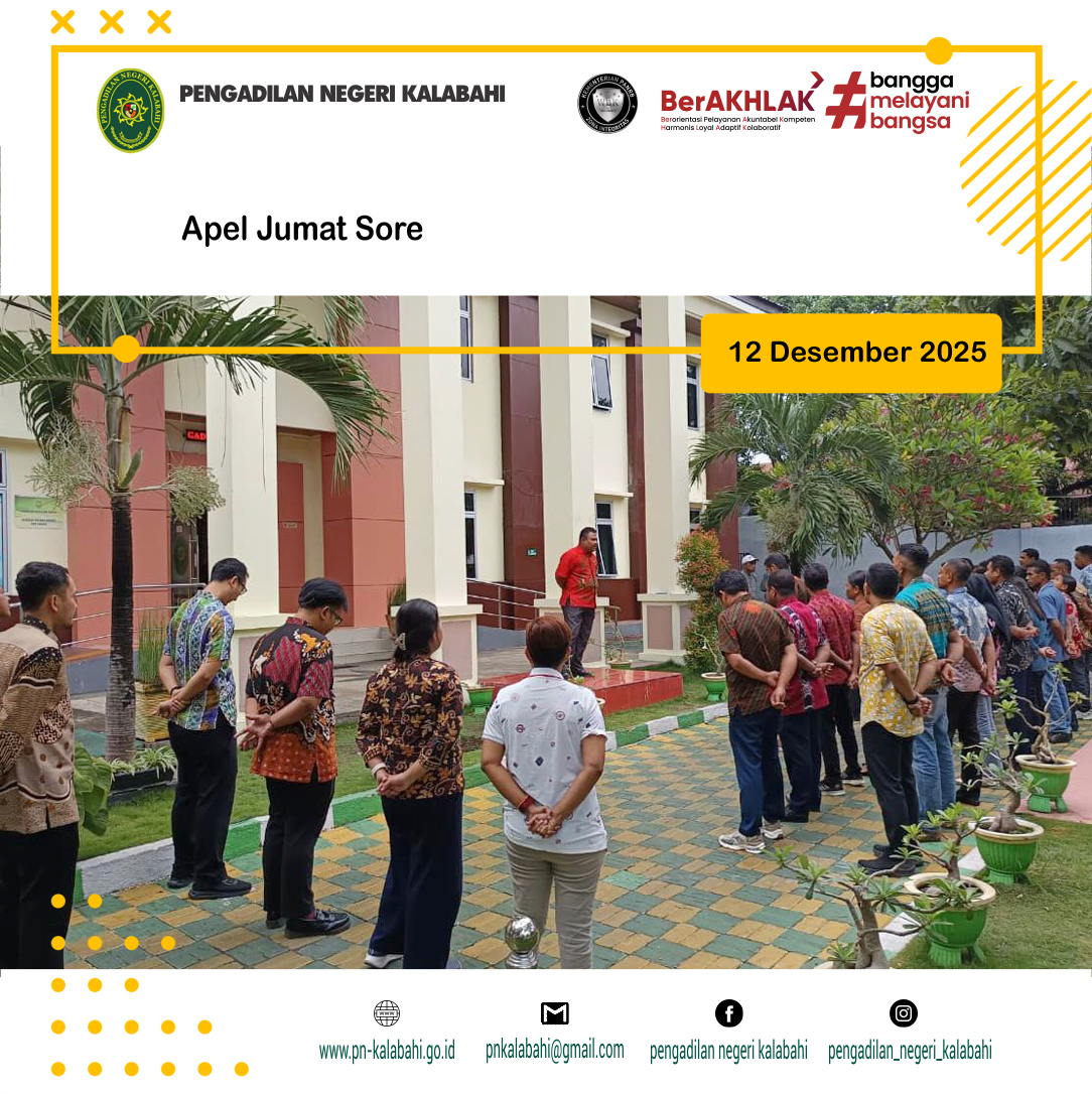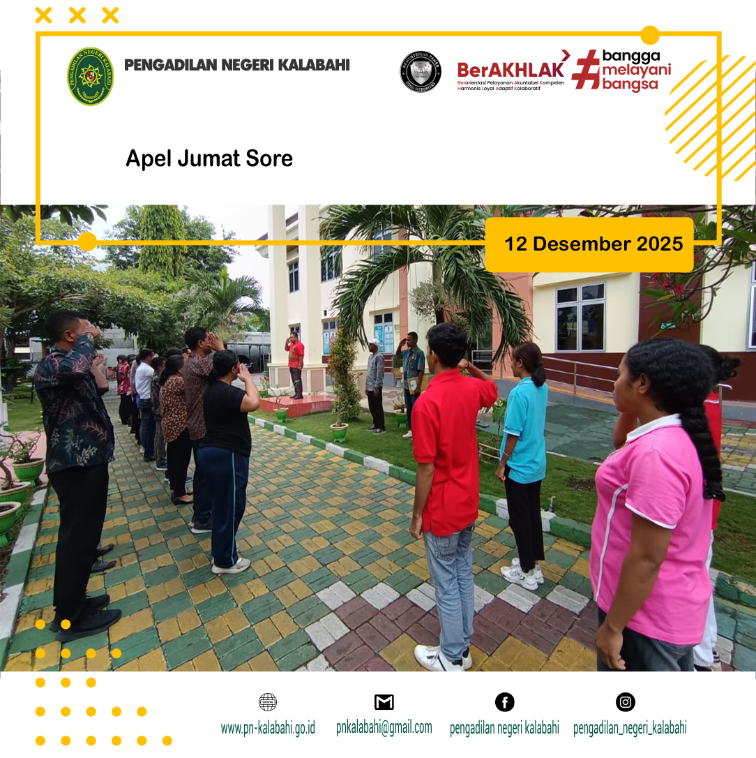 Kalabahi, 12 Desember 2025 Pengadilan Negeri Kalabahi melaksanakan Apel Jumat Sore sebagai bagian dari pembinaan disiplin dan evaluasi kinerja mingguan.