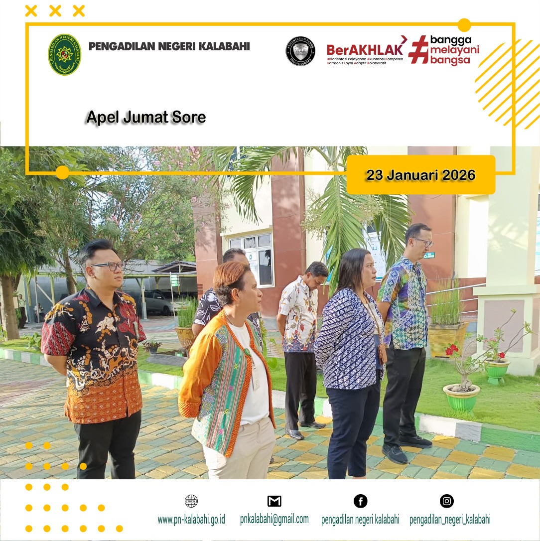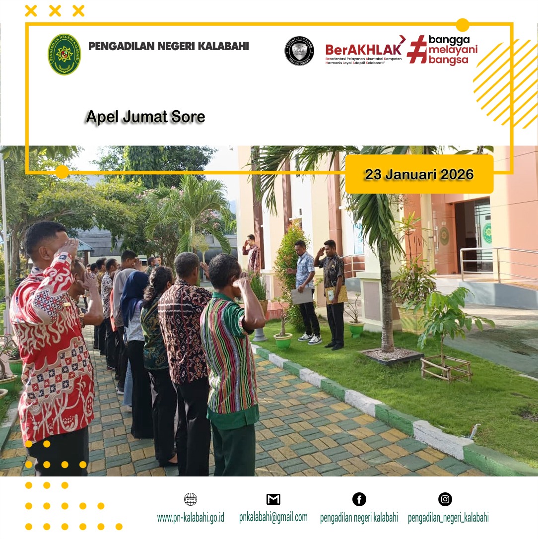 Apel Jumat Sore dilaksanakan sebagai sarana penguatan disiplin, evaluasi kinerja, serta peneguhan komitmen seluruh aparatur Pengadilan Negeri Kalabahi dalam memberikan pelayanan peradilan yang profesional, berintegritas, dan berorientasi pada kepuasan masyarakat.
