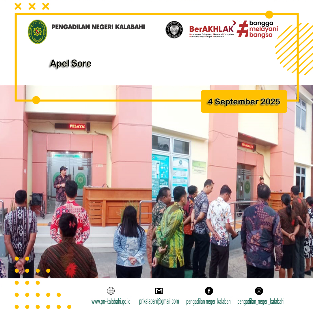 Kalabahi, 4 September 2025 pukul 16.30 WIB bertempat di halaman Kantor Pengadilan Negeri Kalabahi dilaksanakan kegiatan Apel Sore yang dipimpin oleh YM. Ketua Pengadilan Negeri Kalabahi R. M. Suprapto, S.H. Selaku pembina Apel. Selanjutnya yang bertugas sebagai Komandan Apel adalah Bapak Wahyu Born Again Mnanapa (PPNPN). Kegiatan Apel Sore diikuti oleh Para Hakim, Pejabat Struktural dan Fungsional, Pegawai, PPNPN dan Siswa/i Magang SMKN1 Kalabahi pada Pengadilan Negeri Kalabahi.