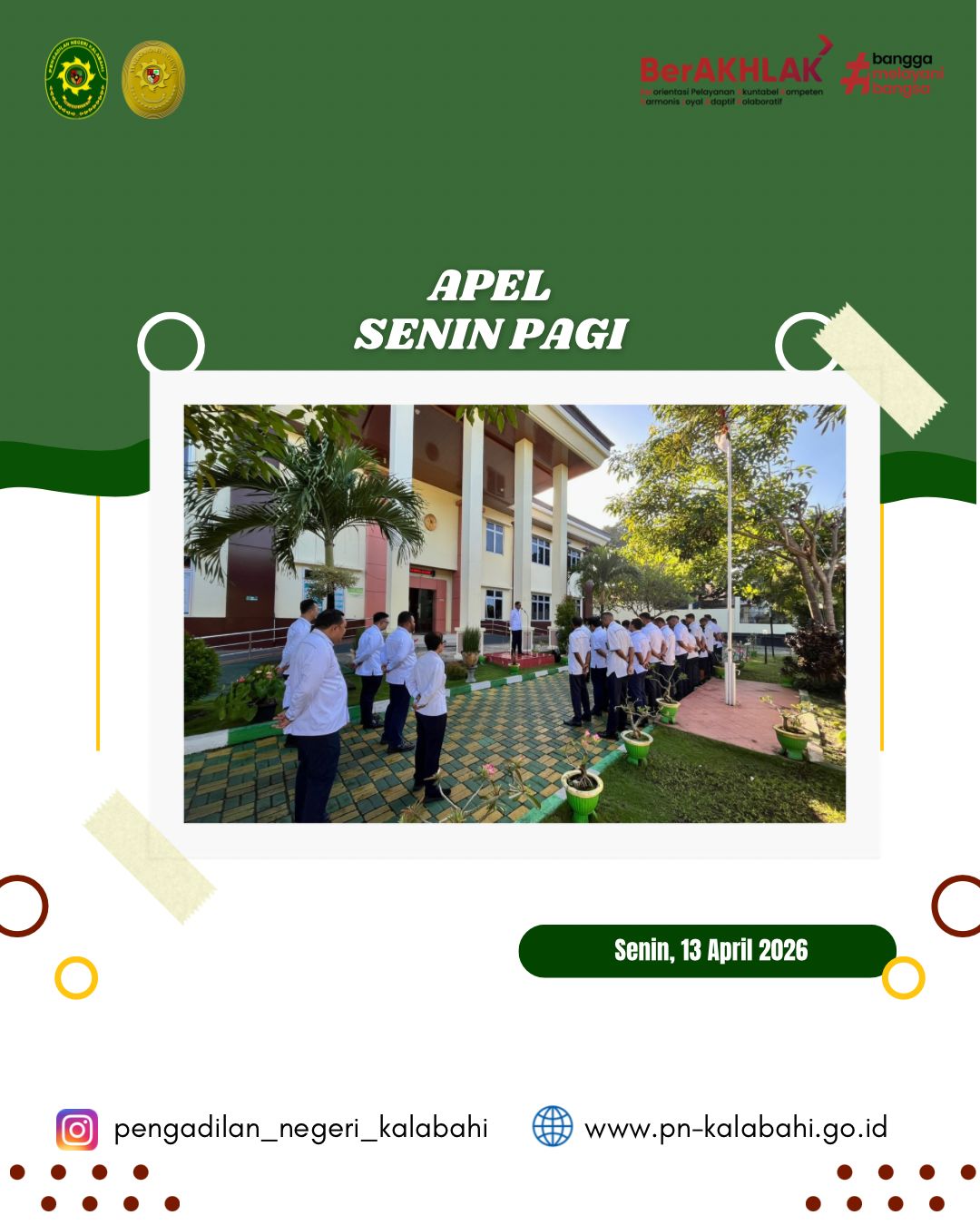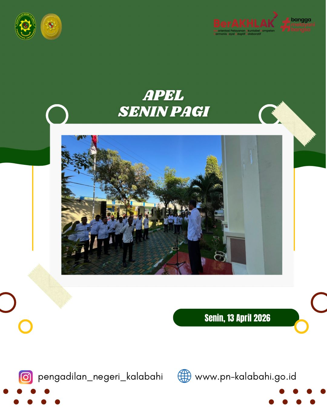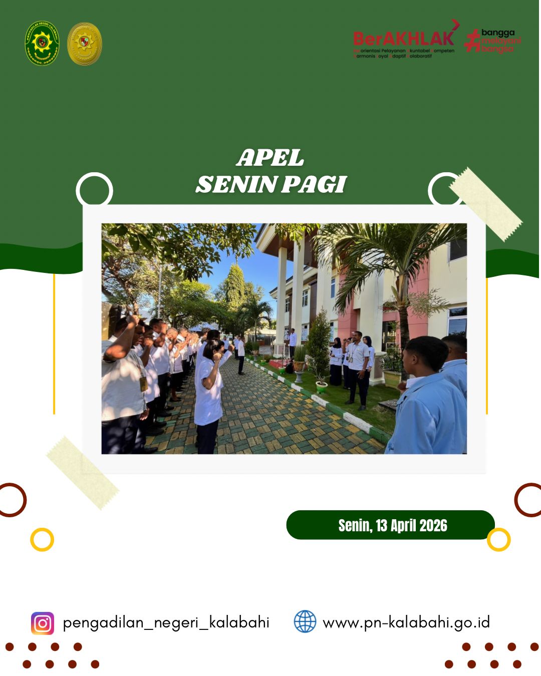 Pada hari Senin, tanggal 13 April 2026 pukul 07.30 WITA, Pengadilan Negeri Kalabahi melaksanakan apel pagi pegawai di halaman kantor. Apel tersebut dipimpin oleh Ketua Pengadilan Negeri Kalabahi dan diikuti oleh seluruh Hakim, Pejabat Struktural dan Fungsional, serta seluruh Pegawai ASN Pengadilan Negeri Kalabahi.