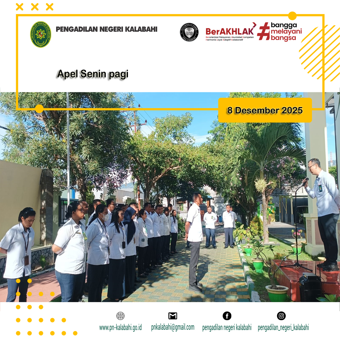 Kalabahi,- Senin 8 Desember 2025 Seluruh aparatur Pengadilan Negeri Kalabahi kembali melaksanakan kegiatan rutin pada hari senin, yaitu apel pagi yang diikuti oleh Pimpinan, para Hakim, Pejabat Struktural dan Pejabat Fungsional, staff, PPPK dan Mahasiswa/i Magang Politeknik Negeri Kupang.