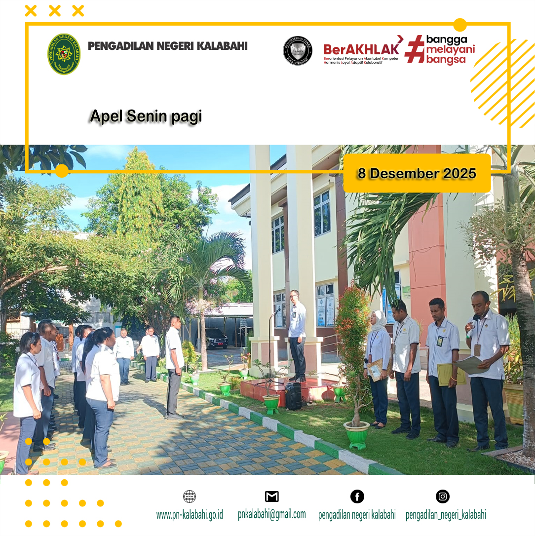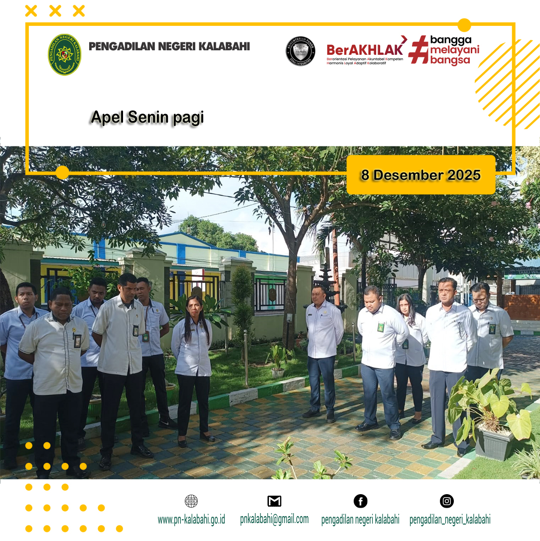 Apel kali ini dipimpin oleh Bapak Eferli A. Korang ., Pelaksana dan dibina oleh Hakim Pengadilan Negeri Kalabahi YM. Bapak. I Gusti Ngurah D. G. Devara, S.H. Sementara itu, pembaca Maklumat Pelayanan pada apel kali ini adalah Pak Zigibertus A Mitak, S.Pi. PPPK, pembacaan 7 nilai utama Mahkamah Agung, dibawakan oleh Pak Iwan Ku., PPPK dan yel-yel oleh Pak Disyon Miludonu PPPK Pada Pengadilan Negeri Kalabahi, dalam amanatnya Pembina Apel menyampaikan untuk tetap menjaga pelayanan yang terbaik di PTSP.