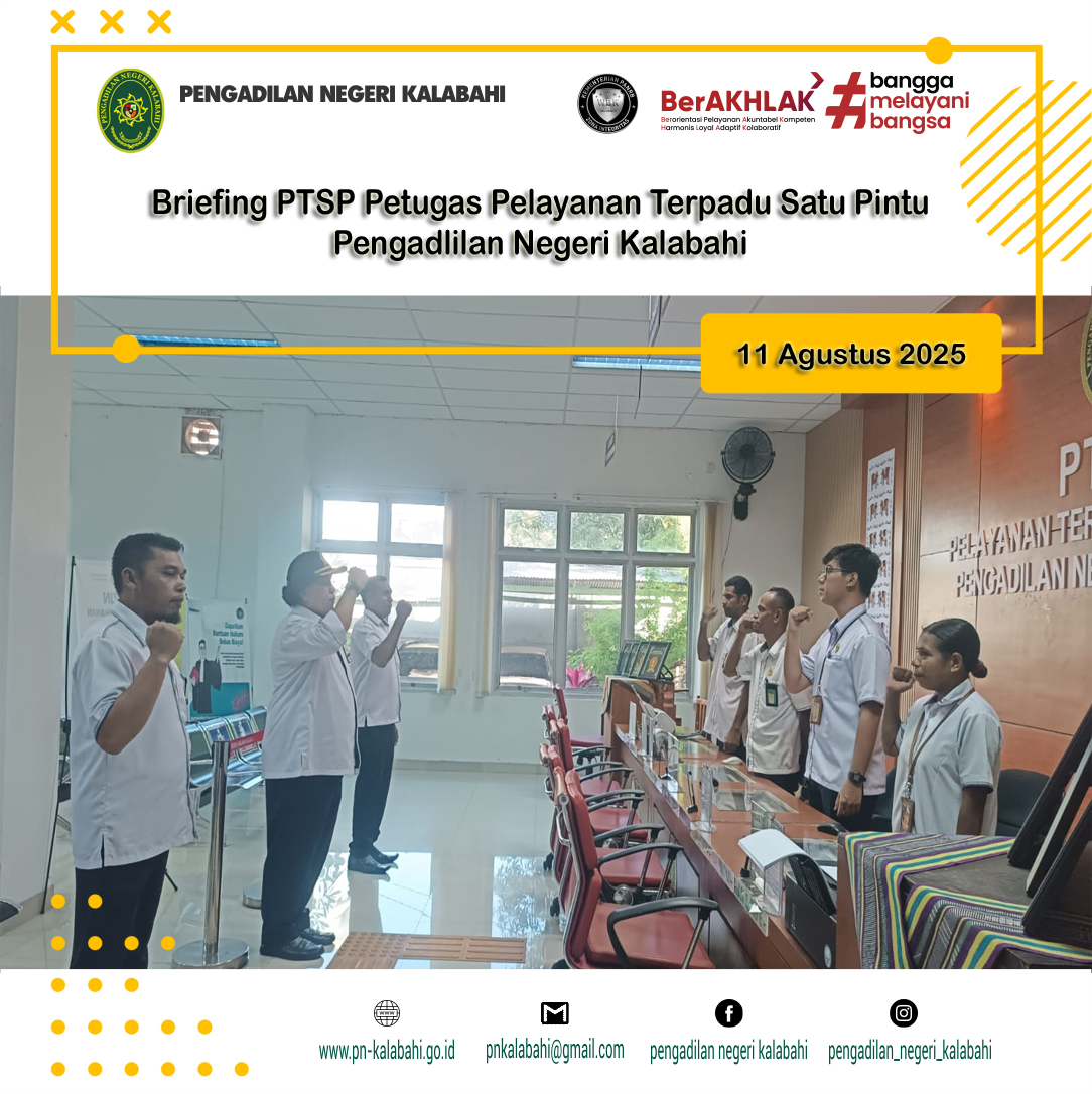 Senin, 11 Agustus 2025, telah dilaksanakan briefing kepada para Petugas Pelayanan Terpadu Satu Pintu (PTSP) Pengadilan Negeri Kalabahi pukul 07.30 WITA. Briefing berupa bimbingan dan arahan diberikan langsung oleh YM. Ketua Pengadilan Negeri Kalabahi, R. M. Suprapto, S.H.