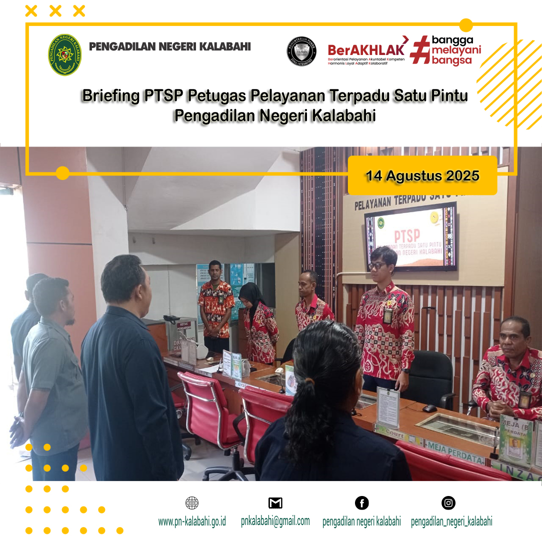 Kamis, 14 Agustus 2025, telah dilaksanakan briefing kepada para Petugas Pelayanan Terpadu Satu Pintu (PTSP) Pengadilan Negeri Kalabahi pukul 07.30 WTA. Briefing berupa bimbingan dan arahan diberikan langsung oleh Sekretaris Pengadilan Negeri Kalabahi, Bapak Novianus Mario Gelu, S.Kom.