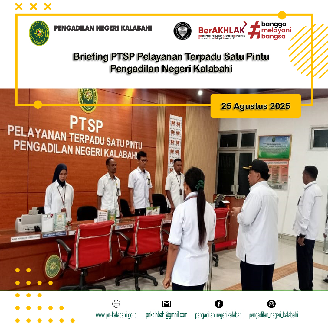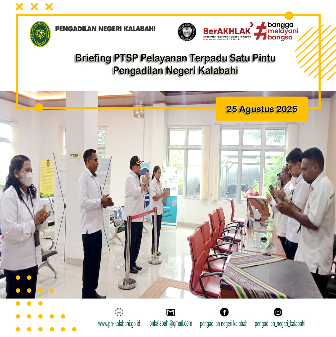 Senin, 25 Agustus 2025, telah dilaksanakan briefing kepada para Petugas Pelayanan Terpadu Satu Pintu (PTSP) Pengadilan Negeri Kalabahi pukul 07.30 WITA. Briefing berupa bimbingan dan arahan diberikan langsung oleh YM. Ketua Pengadilan Negeri Kalabahi, R. M. Suprapto, S.H.