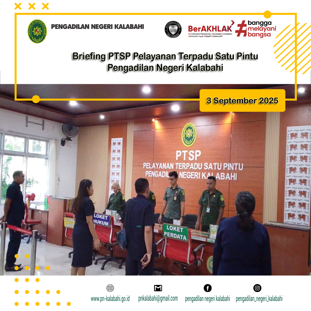 Rabu, 3 September 2025, telah dilaksanakan briefing kepada para Petugas Pelayanan Terpadu Satu Pintu (PTSP) Pengadilan Negeri Kalabahi pukul 07.30 WTA. Briefing berupa bimbingan dan arahan diberikan langsung oleh Panitera Pengadilan Negeri Kalabahi, Ibu Antonia Lipat Ola, S.H.