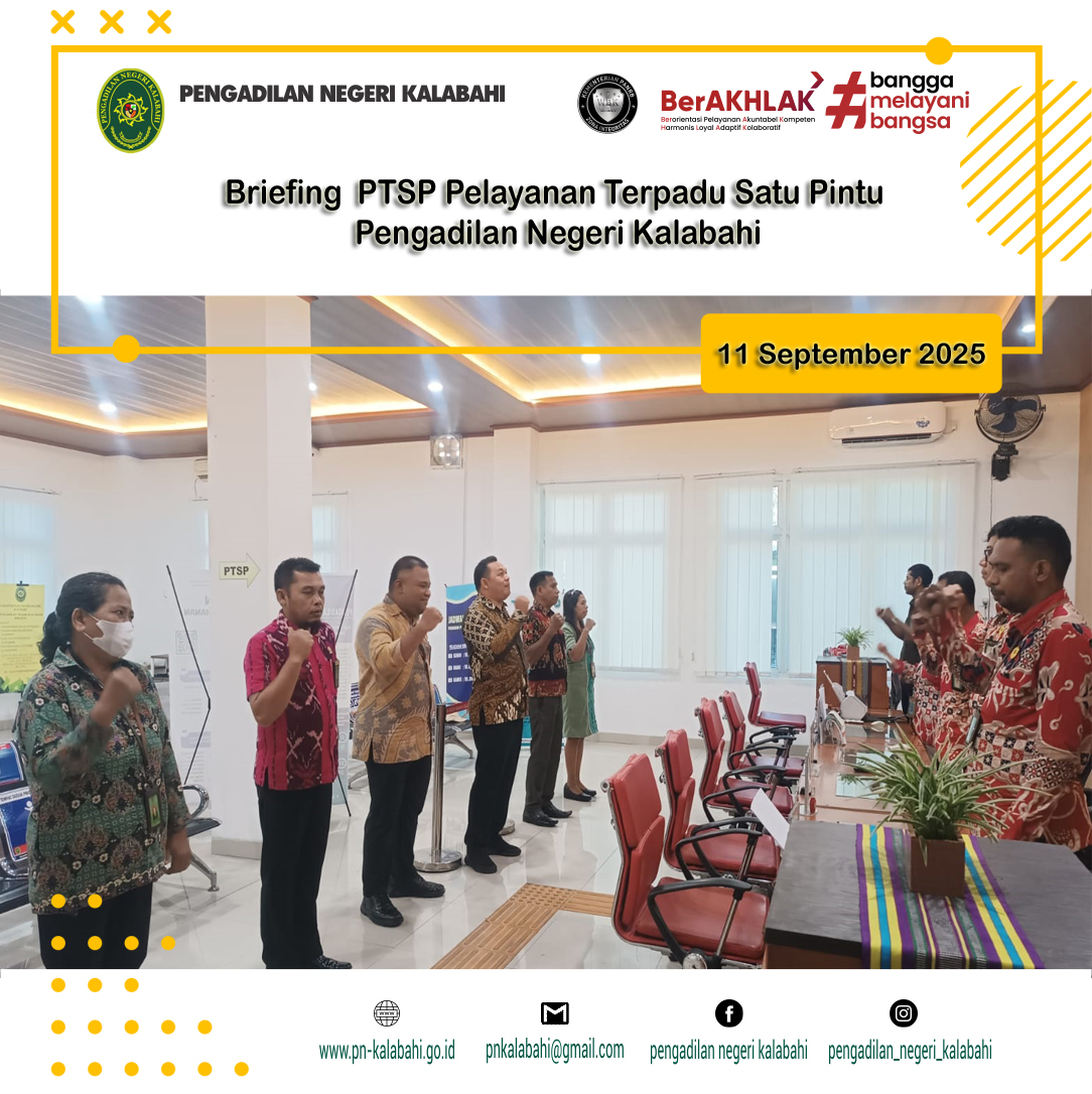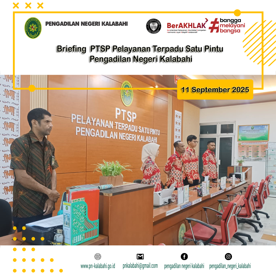 Kamis, 11 September 2025, telah dilaksanakan briefing kepada para Petugas Pelayanan Terpadu Satu Pintu (PTSP) Pengadilan Negeri Kalabahi pukul 07.30 WTA. Briefing berupa bimbingan dan arahan diberikan langsung oleh Hakim Pengawas Pengadilan Negeri Kalabahi,YM Bapak Pramudi Gilang Praseda, S.H.