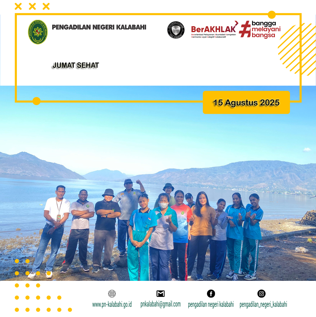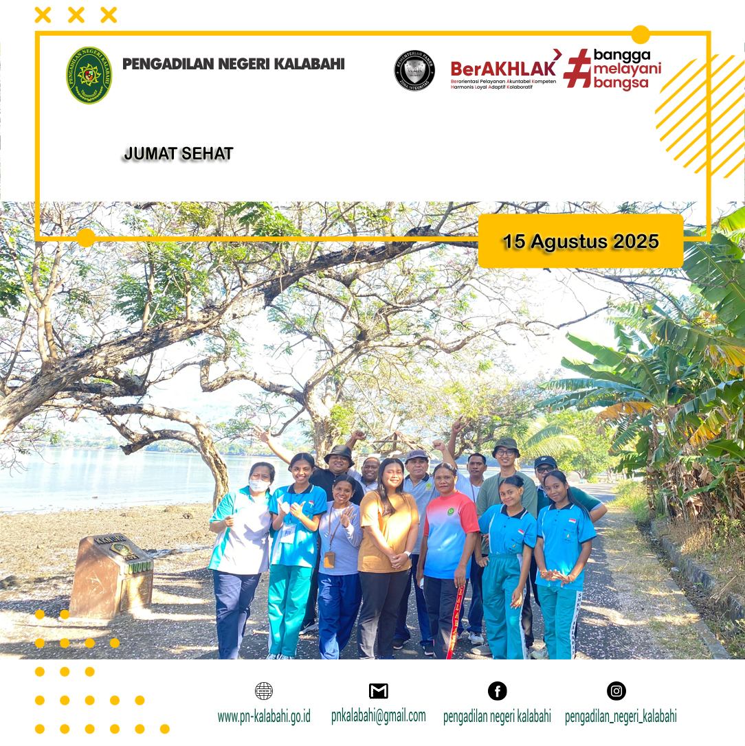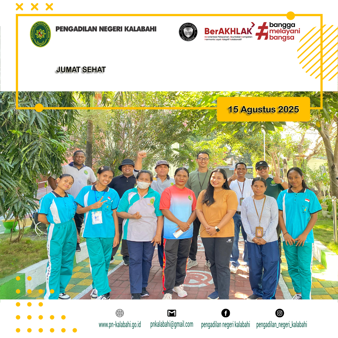 Kalabahi, 15 Agustus 2025, Bertempat di Area kantor Pengadilan Negeri Kalabahi diadakan Acara Jumat Sehat yaitu Jalan Pagi bersama, yang dipimpin oleh YM. Ketua Pengadilan Negeri Kalabahi, Bapak R. M. Suprapto, S.H. , serta diikuti oleh Hakim, Panitera, Sekretaris, Pejabat Struktural, Fungsional, CPNS, PPNPN dan Siswa/i magang SMK N1 Kalabahi.