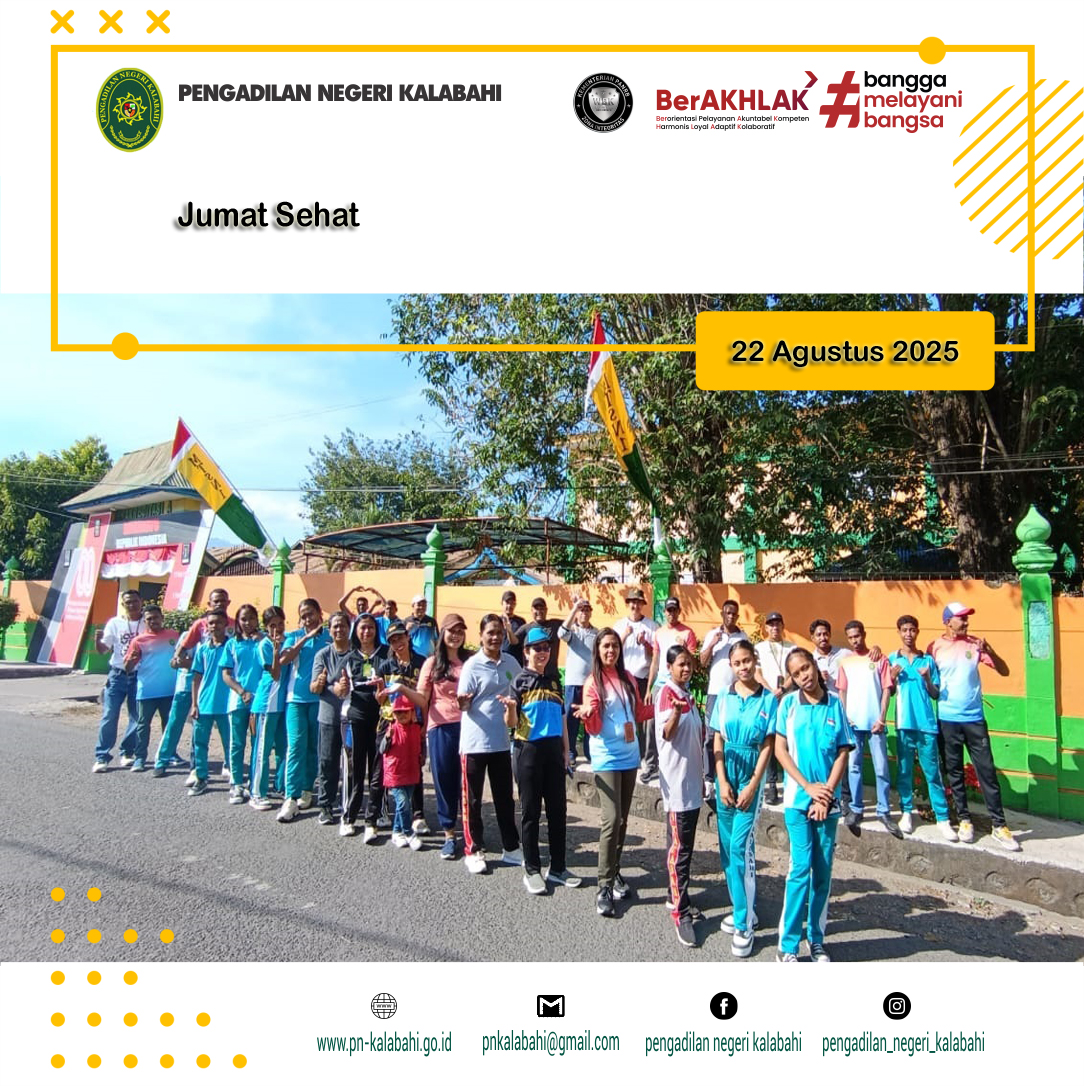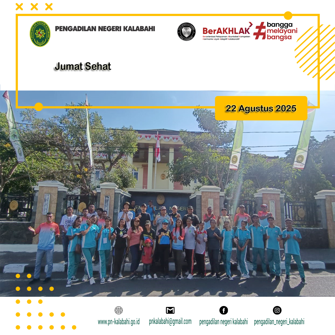 Kalabahi, 22 Agustus 2025, Bertempat di Area kantor Pengadilan Negeri Kalabahi diadakan Acara Jumat Sehat yaitu Jalan Pagi bersama, yang dipimpin oleh YM. Ketua Pengadilan Negeri Kalabahi, Bapak R. M. Suprapto, S.H. , serta diikuti oleh Hakim, Panitera, Sekretaris, Pejabat Struktural, Fungsional, CPNS, PPNPN dan Siswa/i magang SMK N1 Kalabahi.