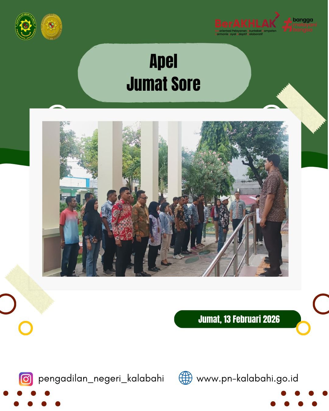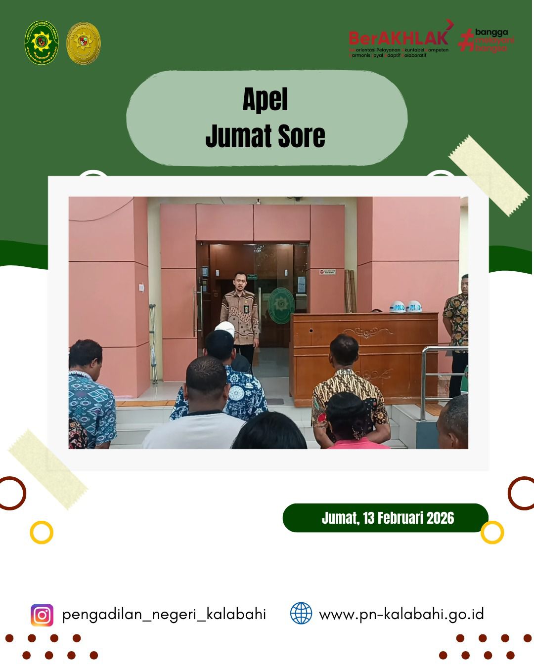 Kalabahi, 13 Februari 2026 – Pengadilan Negeri Kalabahi kembali menyelenggarakan Apel Sore rutin pada pukul 16.30 WITA di Halaman Kantor Pengadilan Negeri Kalabahi. Kegiatan yang dilaksanakan setiap hari Jumat ini menjadi momentum penutup aktivitas kegiatan kerja selama sepekan, sekaligus sarana penguatan kedisiplinan serta menumbuhkan semangat dan kesiapan aparatur dalam meningkatkan kinerja pada awal pekan berikutnya.
