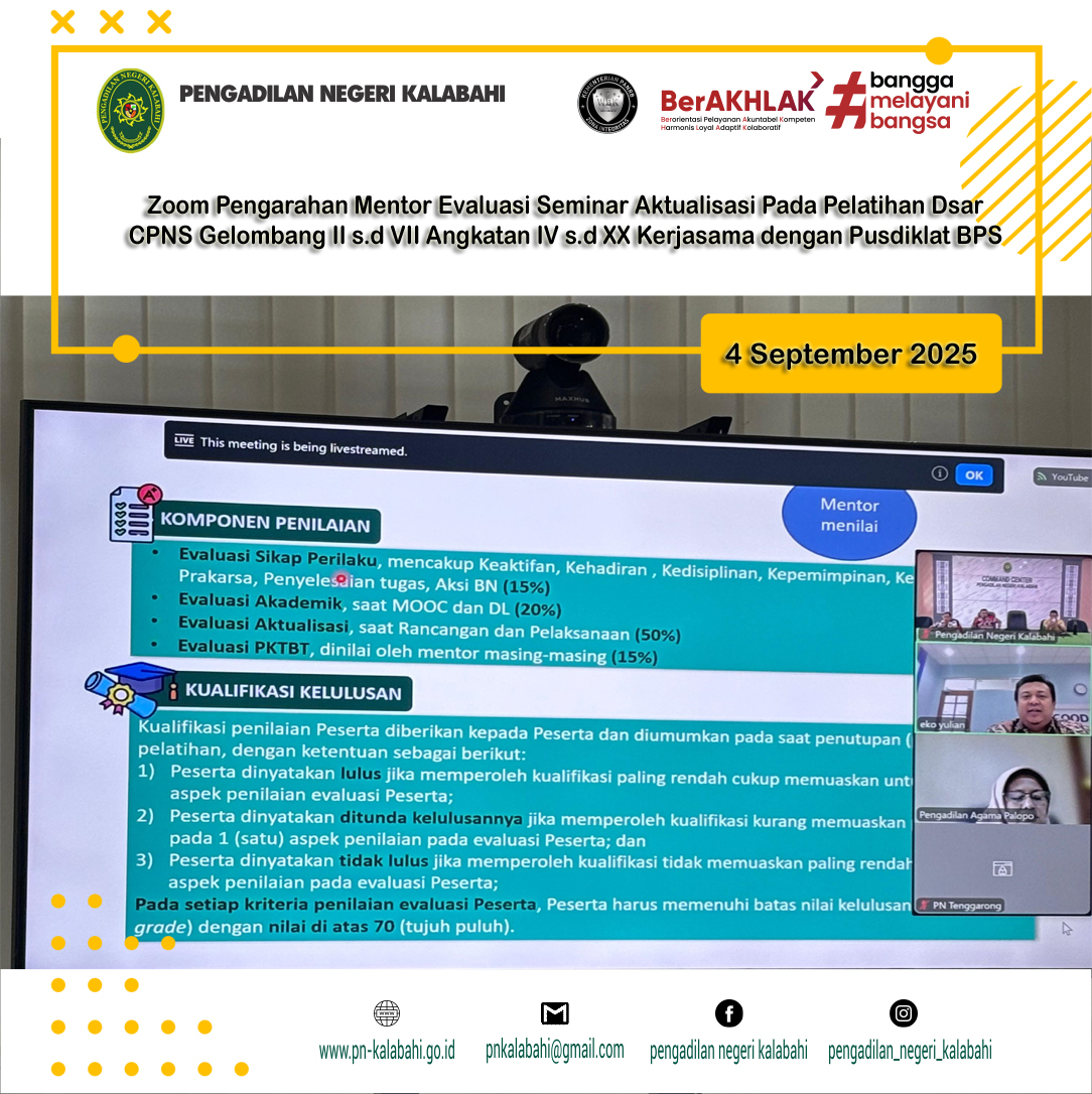 Kalabahi – 4 September 2025 Pengadilan Negeri Kalabahi ikut serta dalam Evaluasi Seminar Aktualisasi Pada Pelatihan Dasar CPNS Gelombang II s.d VII Angkatan IV s.d XX Kerjasama Dengan Pusdiklat BPS yang dilaksanakan pada tanggal Kamis, 4 September 2025 di Ruang Media Center.