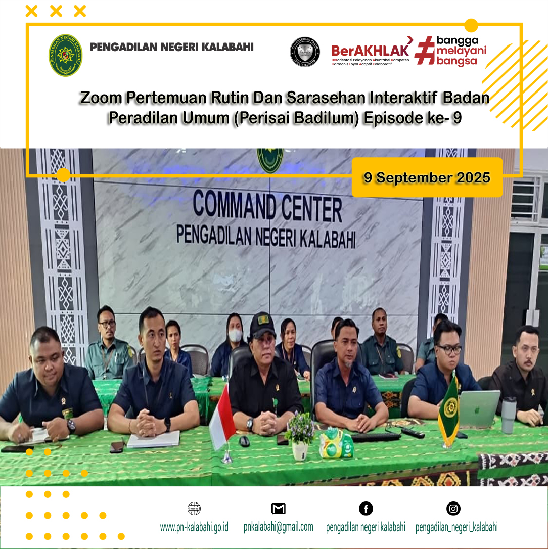 Pengadilan Negeri Kalabahi mengikuti kegiatan Pertemuan Rutin dan Sarasehan Interaktif Badan Peradilan Umum (Perisai Badilum) Episode 9 Tahun 2025 secara daring melalui Zoom Meeting bertempat di Ruang Media Center Pengadilan Negeri Kalabahi.