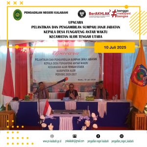 Kamis, 10 Juli 2025, bertempat di Desa Fungafeng, Ketua Pengadilan Negeri Kalabahi yang di wakilkan oleh Bapak Nehemia Nahum Laisimau, S.E. Staf Umum dan Keuangan Pengadilan Negeri Kalabahi serta segenap unsur Forkompimda – Kabupaten Alor menghadiri Upacara Pelantikan dan Pengambilan Sumpah/Janji Jabatan Kepala Desa Fungafeng Antar Waktu Kecamatan ATU.